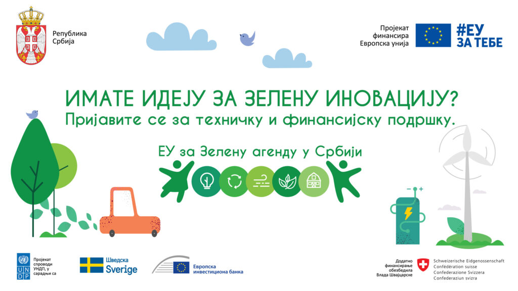 Javni poziv za inovativna rešenja za zelenu tranziciju otvoren je u okviru projekta „EU za Zelenu agendu u Srbiji“ koji, uz tehničku i finansijsku podršku Evropske unije i u partnerstvu sa Ministarstvom zaštite životne sredine, sprovodi UNDP u saradnji sa Ambasadom Švedske i Evropskom investicionom bankom (EIB), uz dodatna finansijska sredstva koja su obezbedile vlade Švedske, Švajcarske i Srbije.