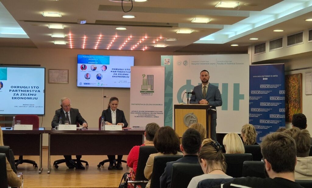 U petak, 04. oktobra 2024. godine, Arhus centar Novi Sad održao je okrugli sto na temu „Partnerstva za zelenu ekonomiju – Jačanje zelene ekonomske kulture kroz održiva rešenja, zelene prakse i IT alate u cilju ublažavanja klimatskih promena u Srbiji“, u partnerstvu sa Misijom OEBS-a u Srbiji, Fakultetom tehničkih nauka iz Novog Sada i kompanijom Lafarge Srbija.