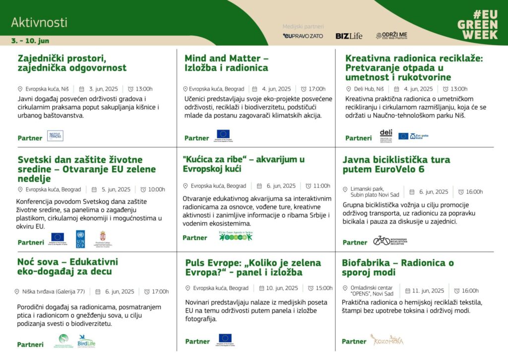 5. jun – Konferencija „Svetski dan životne sredine“ (Beograd) – Paneli na teme zagađenja plastikom, politika EU u oblasti cirkularne ekonomije i prilika za Srbiju u zelenoj tranziciji.