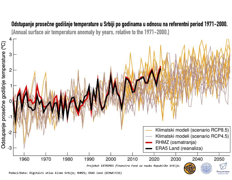 Klimatski modeli su jedan od razloga zašto ovo ne iznenađuje one koji istražuju klimu i klimatske promene. Na slici dole, prikazano je odstupanje prosečne godišnje temperature u Srbiji dobijeno iz rezultata 8 klimatskih modela (za 2 scenarija), koji su preuzeti sa Digitalnog atlasa klime Srbije (https://lnkd.in/g3cpX9Mr), zajedno sa osmotrenim vrednostima Republičkog hidrometeorološkog zavoda Srbije i Copernicus ECMWF reanalizom.