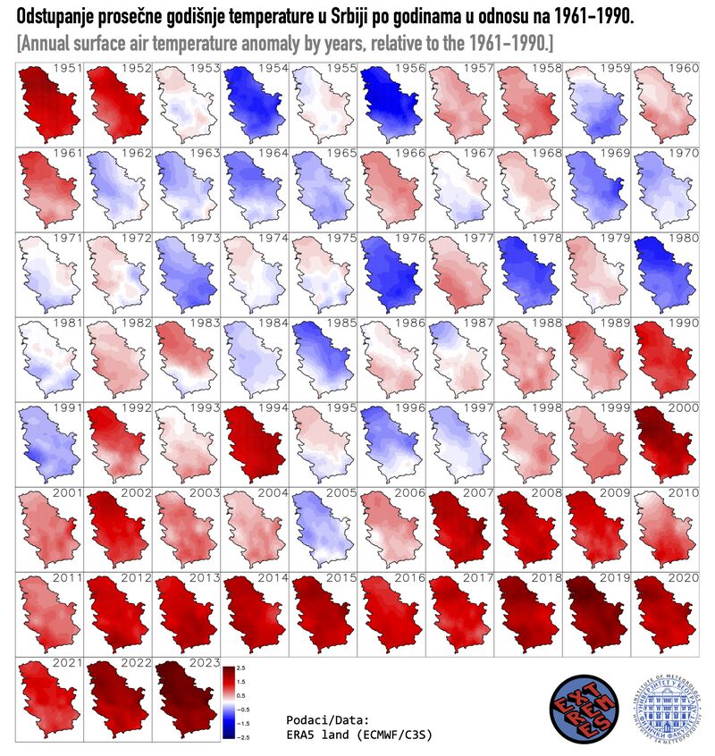 Kako su izgledale pojedinačne godine od 1951. do 2023. možete pogledati na slici dole. Poslednja godina za negativnom anomalijom u odnosu na period 1961-1990 bila je 2005., skoro pre 20 godina!